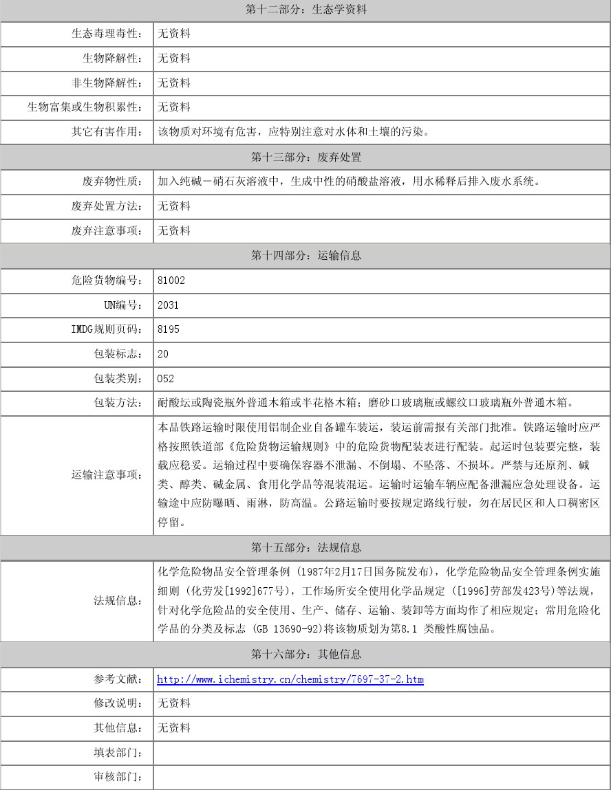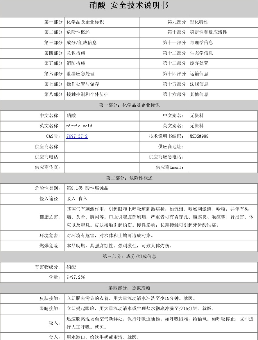 硝酸又稱硝鏹水、鏹水、氨氮水、稀硝酸、濃硝酸、發(fā)煙硝酸。是一種強氧化性、腐蝕性的強酸。硝酸易溶于水,常溫下其溶液無色透明。其不同濃度水溶液性質(zhì)有別,市售濃硝酸為恒沸混合物,質(zhì)量分?jǐn)?shù)為69.2%(約16mol/L),質(zhì)量分?jǐn)?shù)足夠大(市售濃度為95%以上)的,稱為發(fā)煙硝酸。硝酸易見光分解,應(yīng)在棕色瓶中于陰暗處避光保存,嚴(yán)禁與還原劑接觸